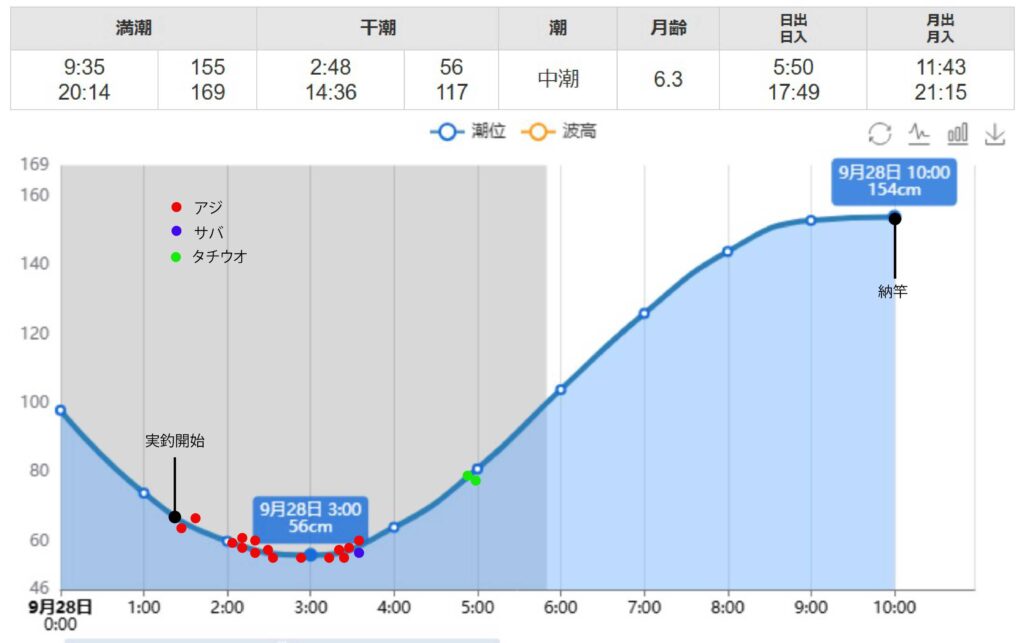 投げても投げてもアタリ無し。棚を色々と変えても効果は無く、7時半頃から棚を1ヒロ半としてカツオ狙いをするも撃沈。時折小規模ナブラが出たのでルアーを投げてみたがヒットせず。写真を撮り忘れたがベイトは8cmほどのカタクチイワシだった。あまりの釣れなさに早々に帰ろうかと思ったが、満潮からの下げに期待して粘ってみる。流れが右から左に変わったが状況は変わらず10:00でギブアップ、納竿としました。