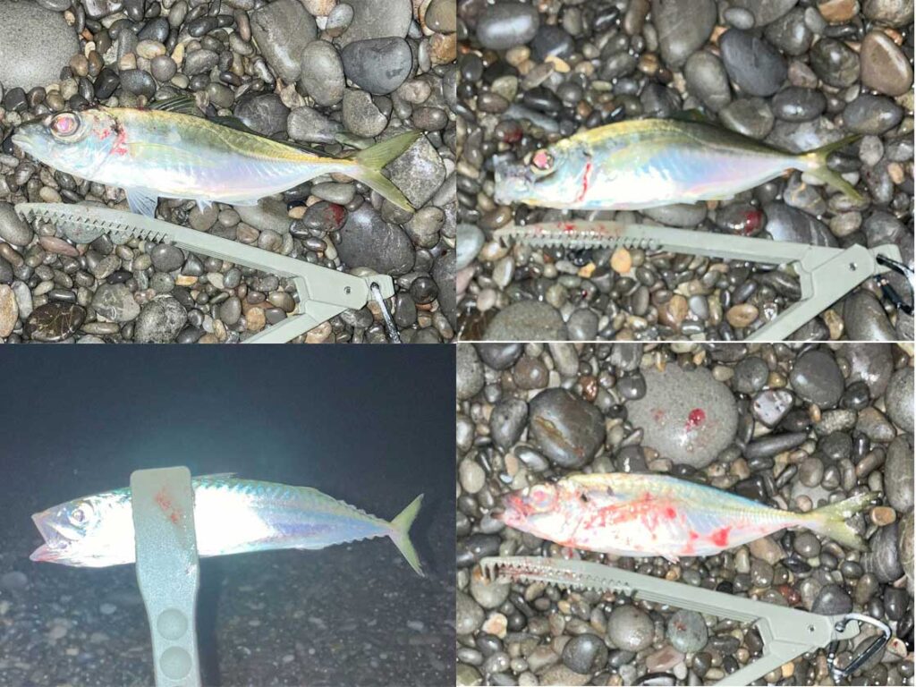 3時半をまわった時点でサバが混じり出した。フワフワと変なアタリが出る犯人だ。(3:20、3:25、3:35、3:39/棚1ヒロ)お土産は十分なので3:39の魚を最後にアジ釣りは終了とし、タチウオ狙いの準備をする。