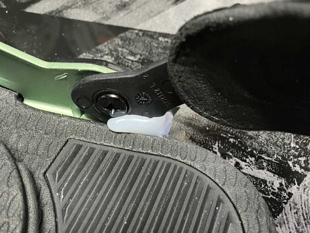 ということでトゥストラップを無理やりホットメルトで動かないように固定しました。これで3ステップで装着できるので快適です。
